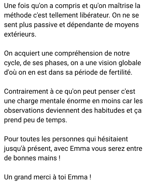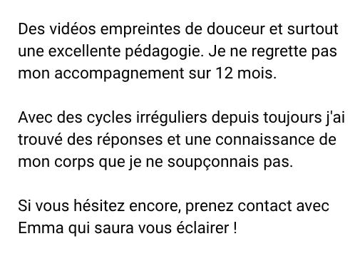 Claire a trouvé les pratiques qui apaisaient son corps et est devenue autonome dans la gestion de sa fertilité en appliquant les conseils que je vais te livrer dans les ateliers.